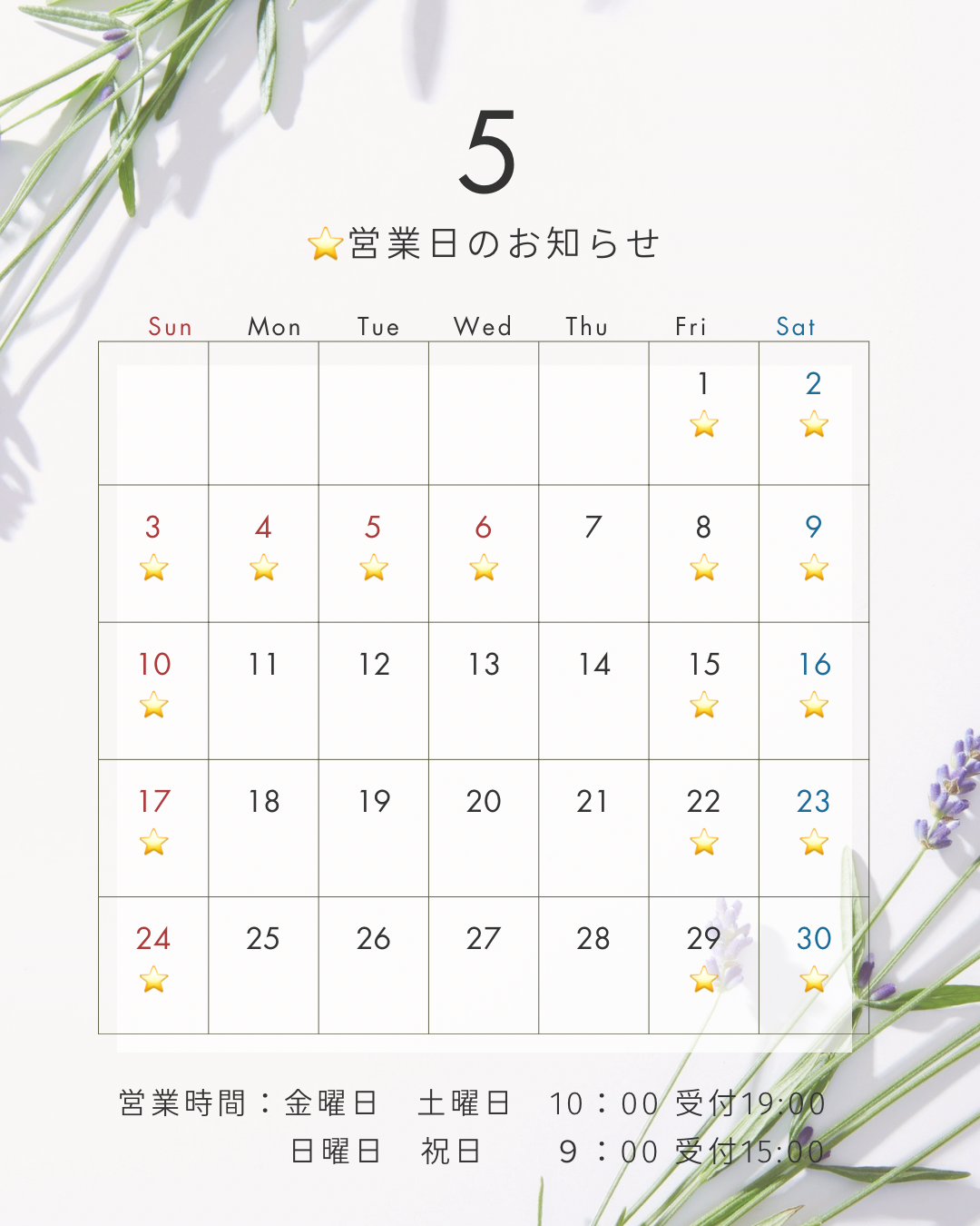 | 最終受付 | 金曜と土曜は19時 日曜と祝日は15時 |